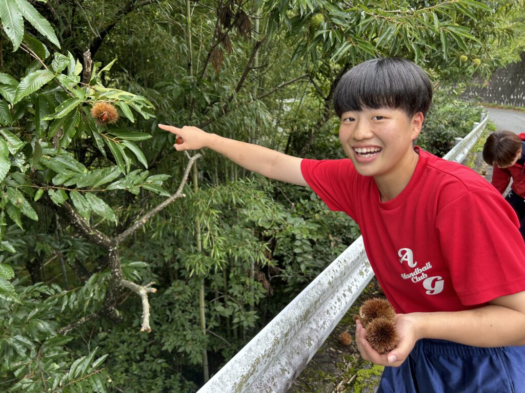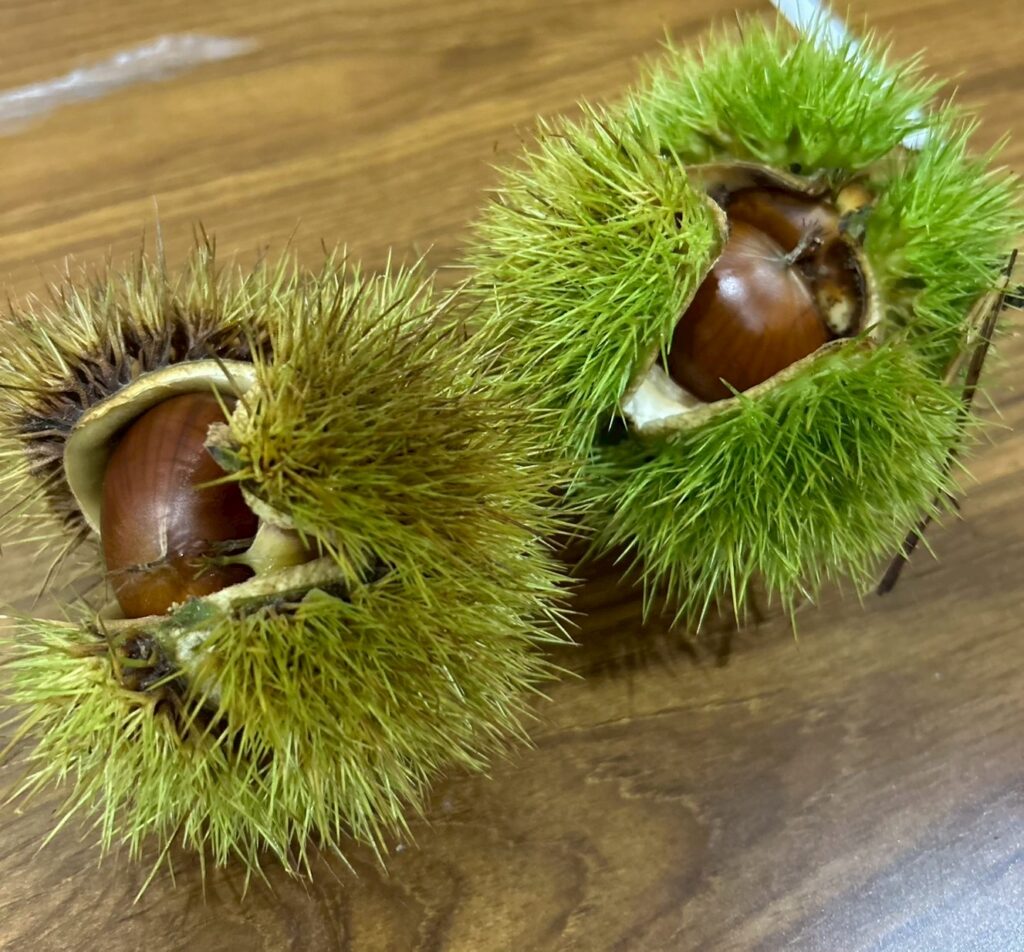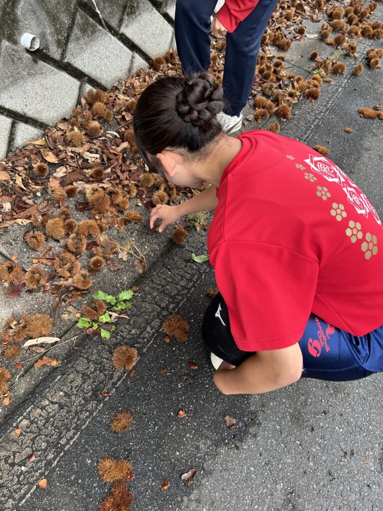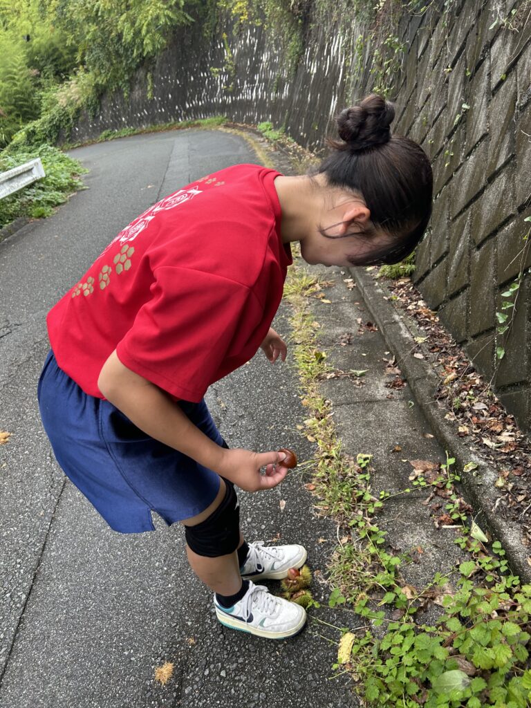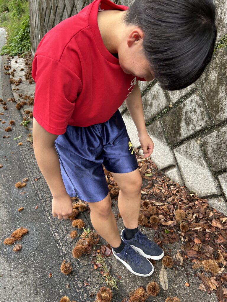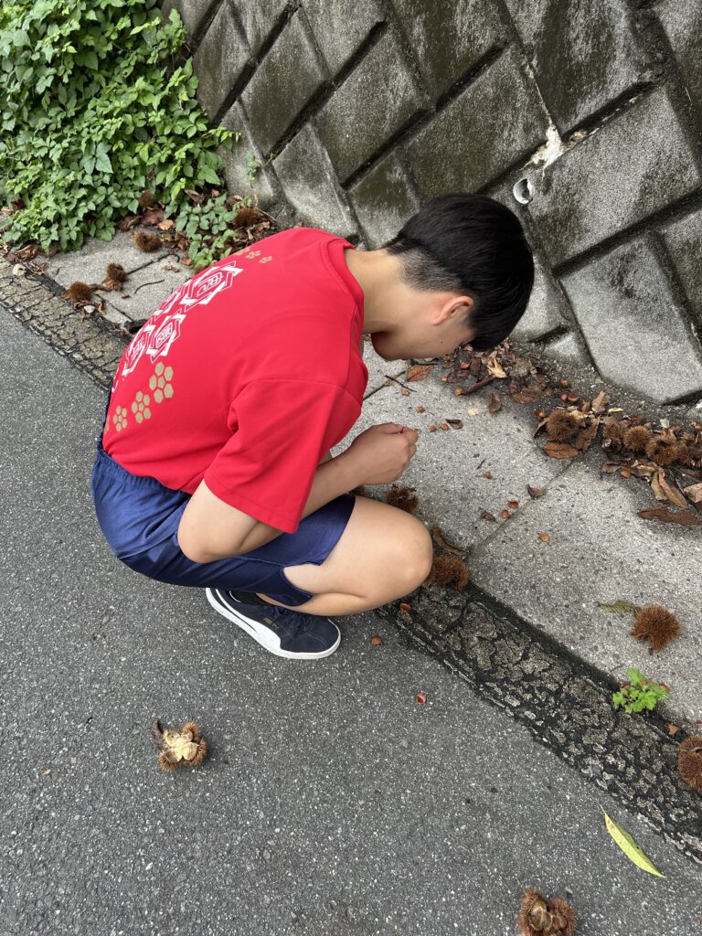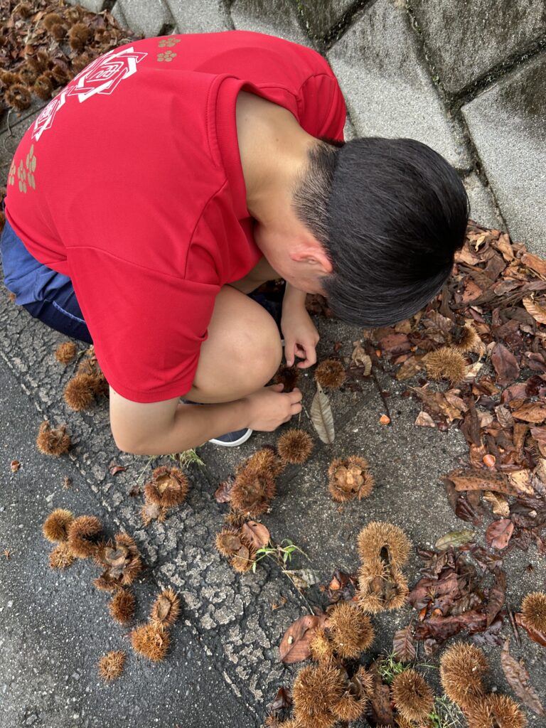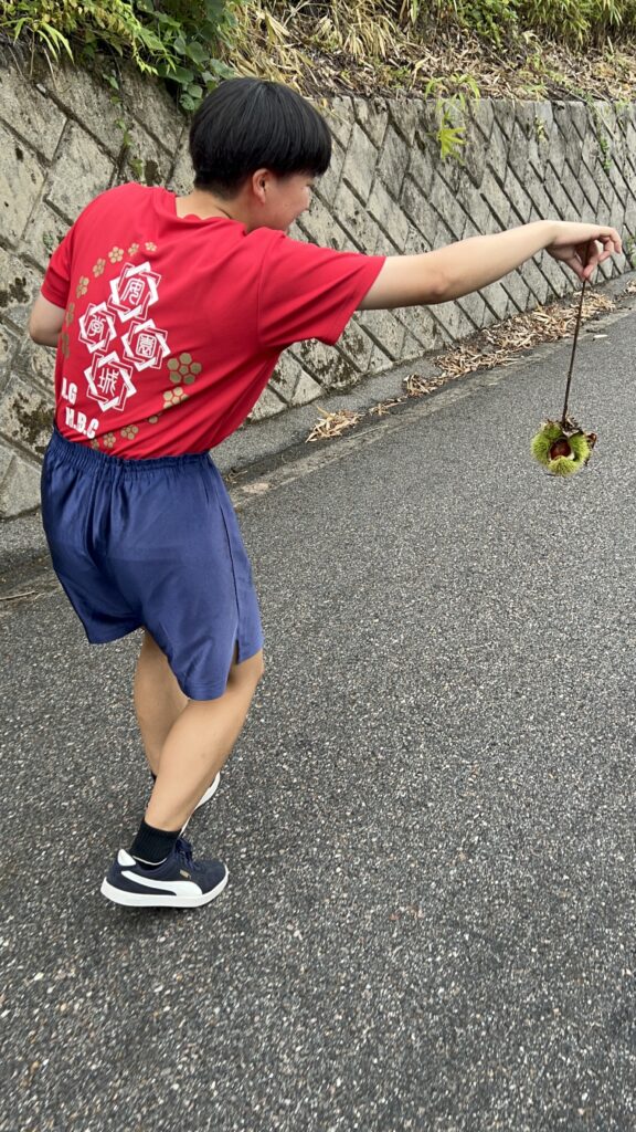 みんなに見せてあげよ!!って持つのですがイガのチクチクが痛すぎて、さらに大はしゃぎ🤣